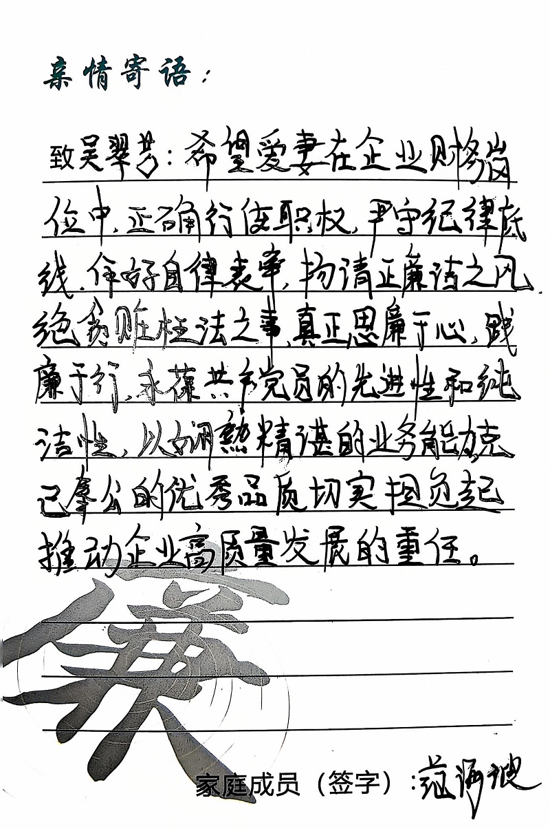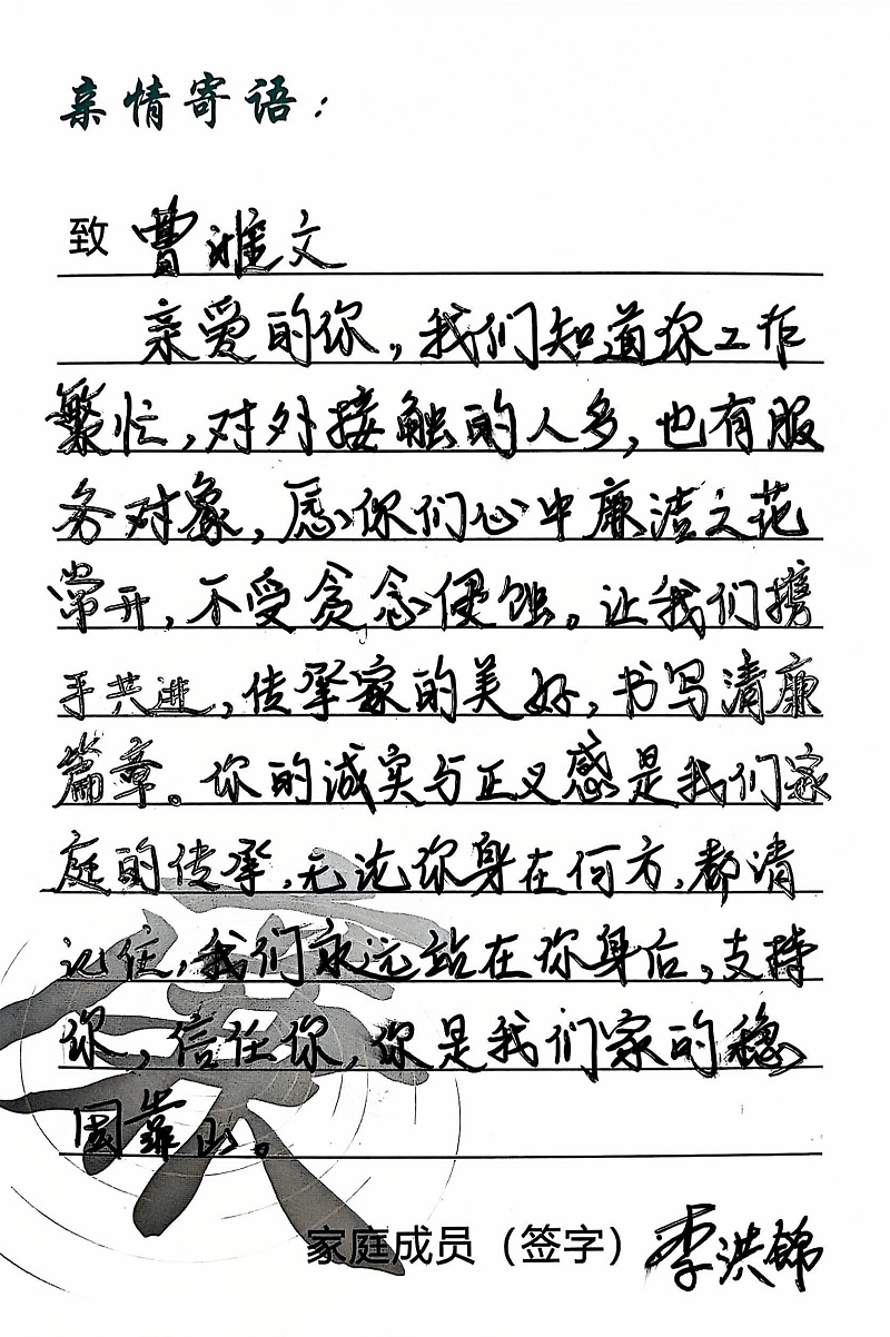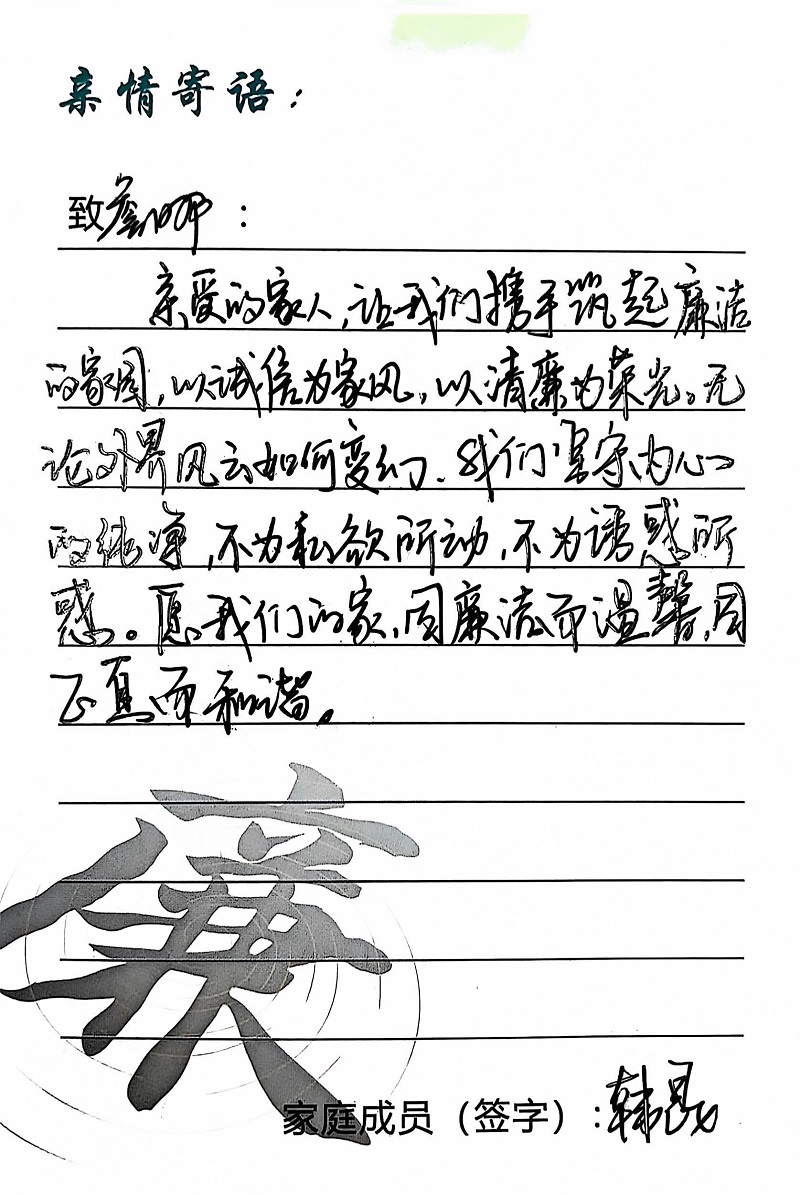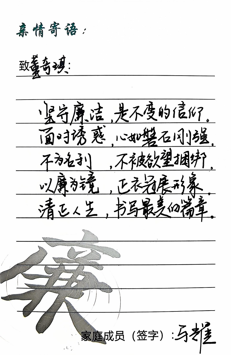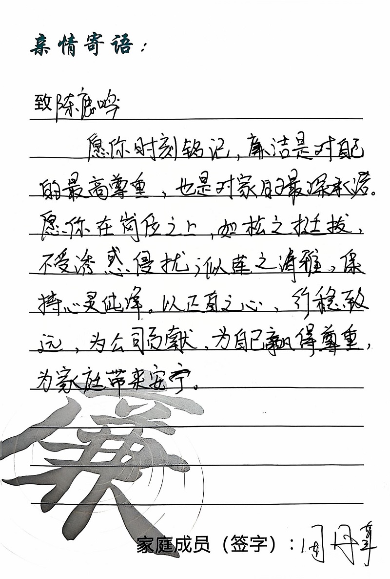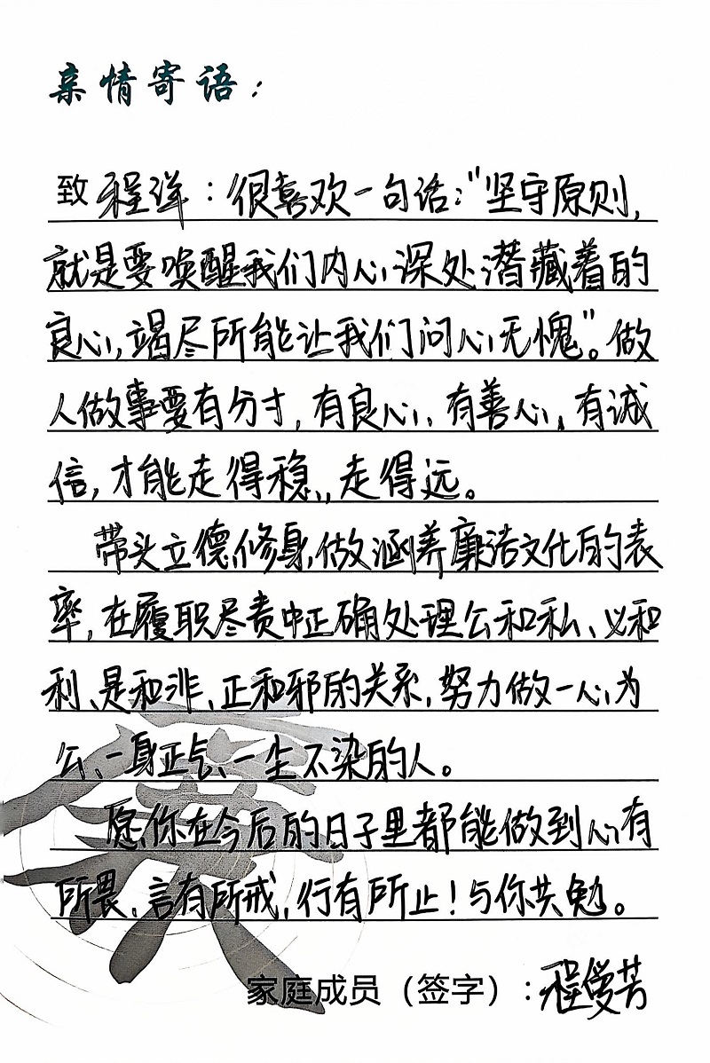 為深入學(xué)習(xí)黨的二十大精神,貫徹落實(shí)習(xí)近平總書記關(guān)于注重家庭家教家風(fēng)建設(shè)的重要論述,營造公司崇廉、尚廉、踐廉、助廉的良好氛圍,城投公司組織開展了“家滿清風(fēng)·廉潤城投”廉潔文化活動;顒娱_展以來,共征集廉政寄語210余條。經(jīng)各部門、子公司推薦,城投公司相關(guān)部門審核,評選出優(yōu)秀廉潔寄語43條,F(xiàn)將優(yōu)秀廉政寄語分批次進(jìn)行展播,快來一起欣賞吧!