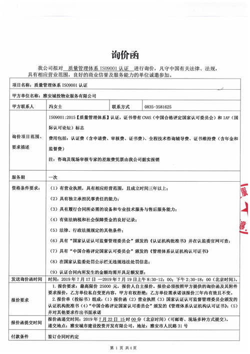 質(zhì)量管理體系ISO9001認(rèn)證詢價(jià)函