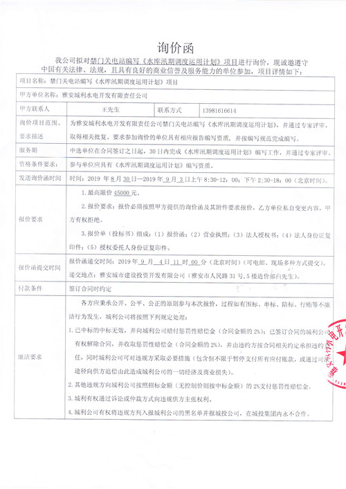 雅安城利水電開(kāi)發(fā)有限責(zé)任公司禁門關(guān)電站編寫《水庫(kù)汛期調(diào)度運(yùn)用計(jì)劃》項(xiàng)目競(jìng)爭(zhēng)性談判公告