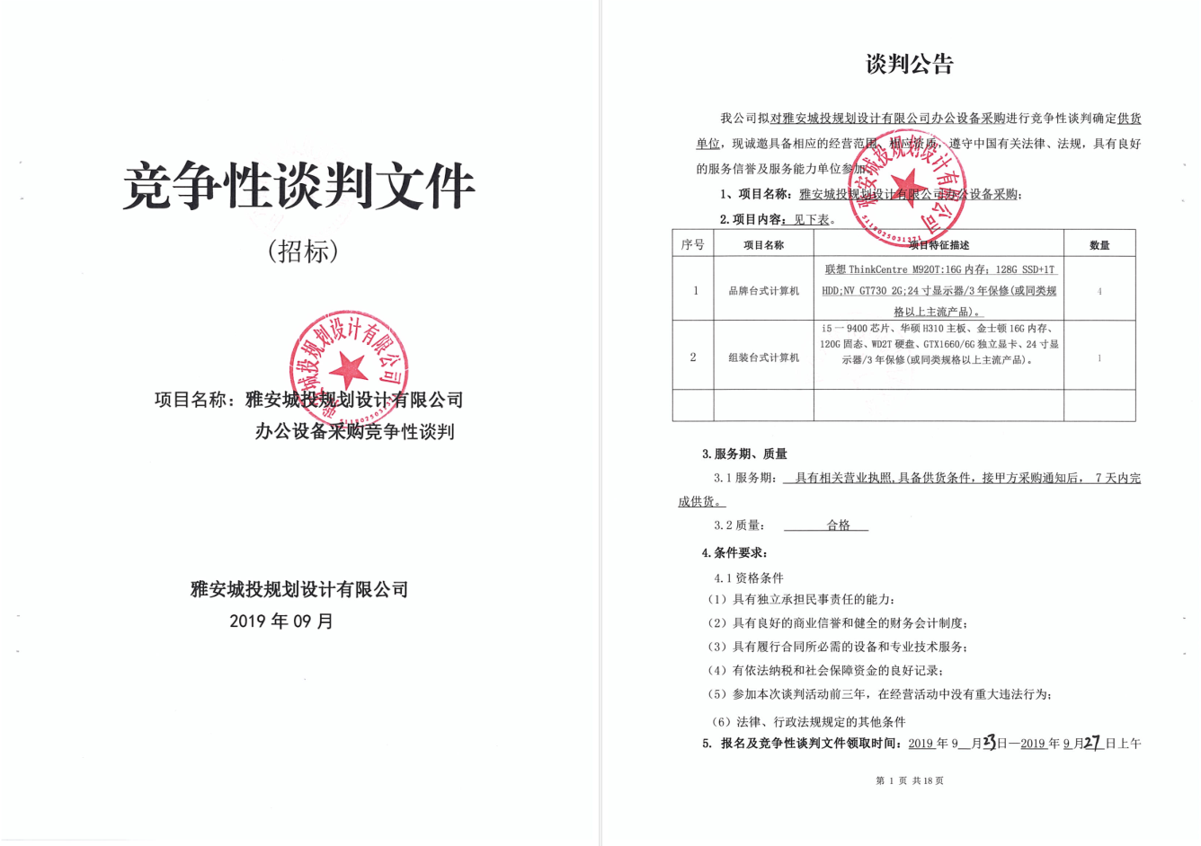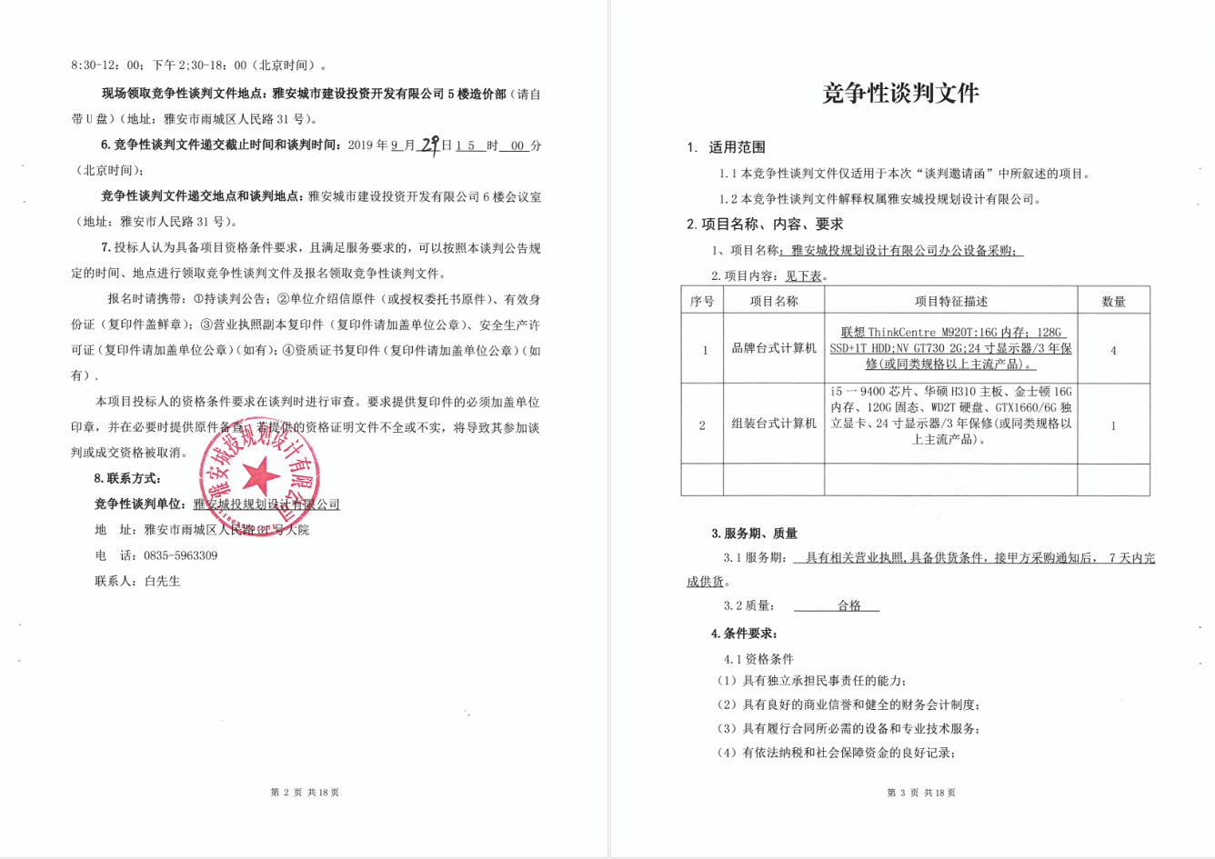 雅安城投規(guī)劃設(shè)計有限公司辦公設(shè)備采購進(jìn)行競爭性談判的公告