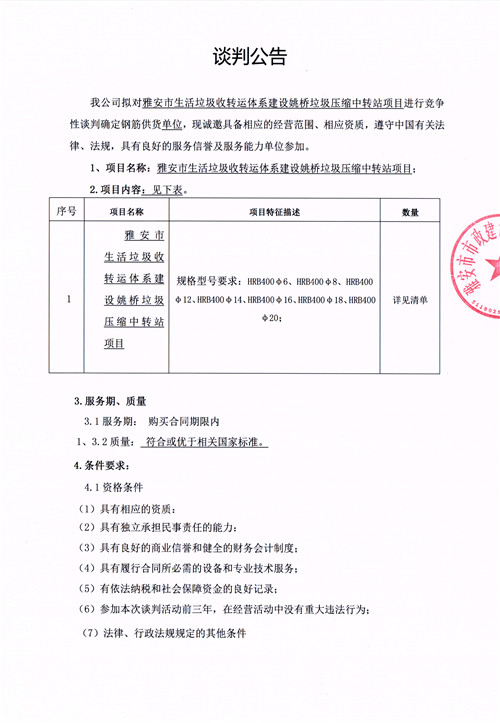 雅安市生活垃圾轉(zhuǎn)運體系建設(shè)姚橋垃圾壓縮中轉(zhuǎn)站項目確定鋼筋供貨單位的競爭性談判公告