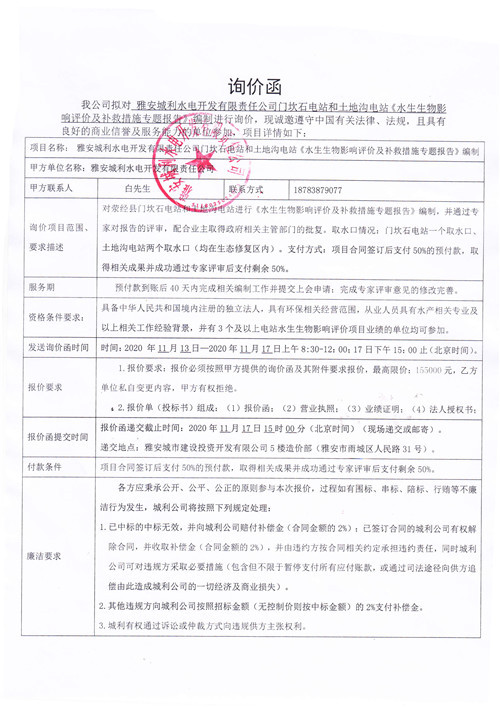 城利水電公司門坎石電站和土地溝電站《水生生物影響評價及補救措施專題報告》詢價函