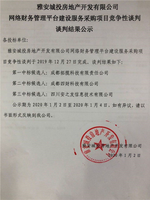 雅安城投房地產(chǎn)開發(fā)有限公司網(wǎng)絡(luò)財(cái)務(wù)管理平臺(tái)建設(shè)服務(wù)采購(gòu)項(xiàng)目競(jìng)爭(zhēng)性談判結(jié)果公司