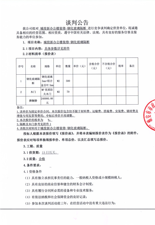 城投公司新辦公樓裝修-鋼化玻璃隔斷競爭性談判公告