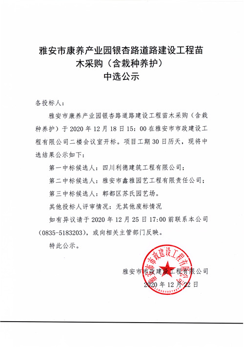 雅安市康養(yǎng)產(chǎn)業(yè)園銀杏路道路建設(shè)工程苗木采購(含栽種養(yǎng)護(hù))中選公示