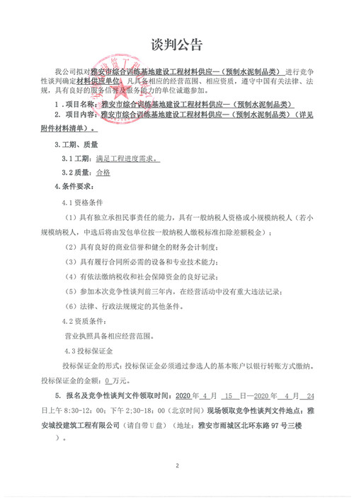 城投建工雅安市綜合訓練基地建設工程材料供應—(預制水泥制品類)競爭性談判公告