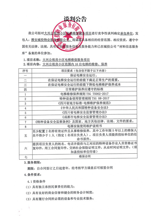 城投物業(yè)公司大興公租房小區(qū)電梯維保服務項目競爭性談判公告