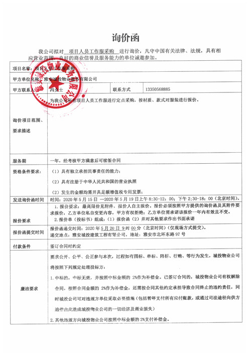 城投物業(yè)公司項(xiàng)目人員工作服采購詢價(jià)函