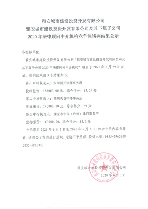 雅安城市建設(shè)投資開發(fā)有限公司及其下屬子公司2020年法律顧問中介機(jī)構(gòu)競爭性談判結(jié)果公示