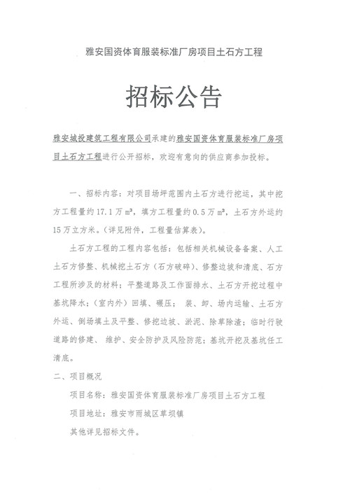 城投建工公司雅安國資體育服裝標(biāo)準(zhǔn)廠房項目土石方工程招標(biāo)公告