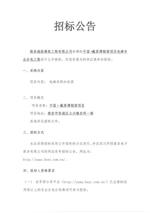 城投建工公司中國·藏茶博物館項目電梯專業(yè)分包工程招標(biāo)公告