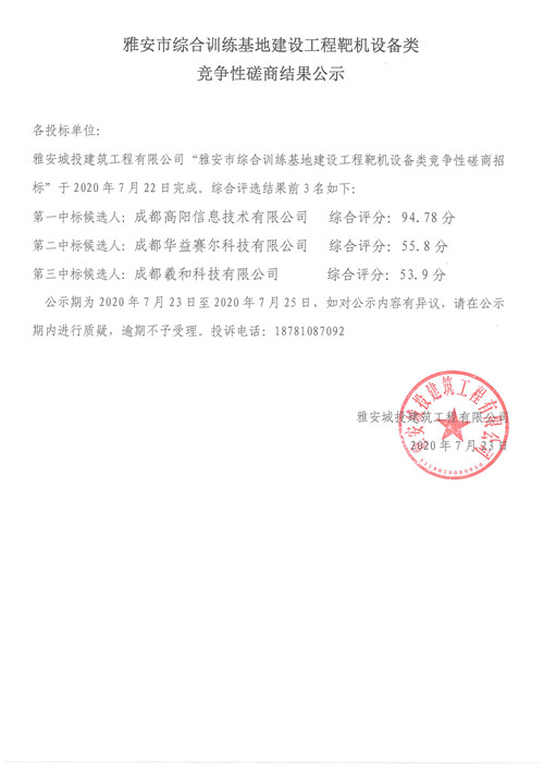 城投建工公司雅安市綜合訓(xùn)練基地建設(shè)工程靶機(jī)設(shè)備類(lèi)競(jìng)爭(zhēng)性磋商結(jié)果公示