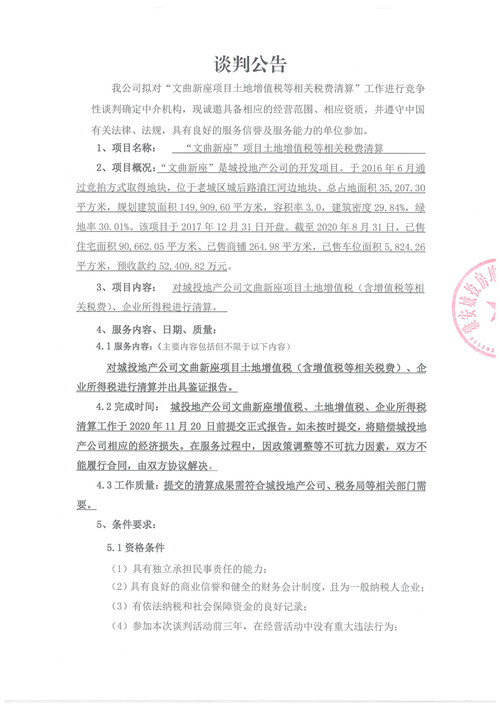 城投房地產(chǎn)公司“文曲新座項目土地增值稅等相關(guān)稅費清算”工作競爭性談判公告