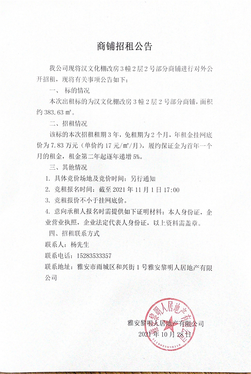 漢文化棚改房3幢2層2號商鋪對外招租公告