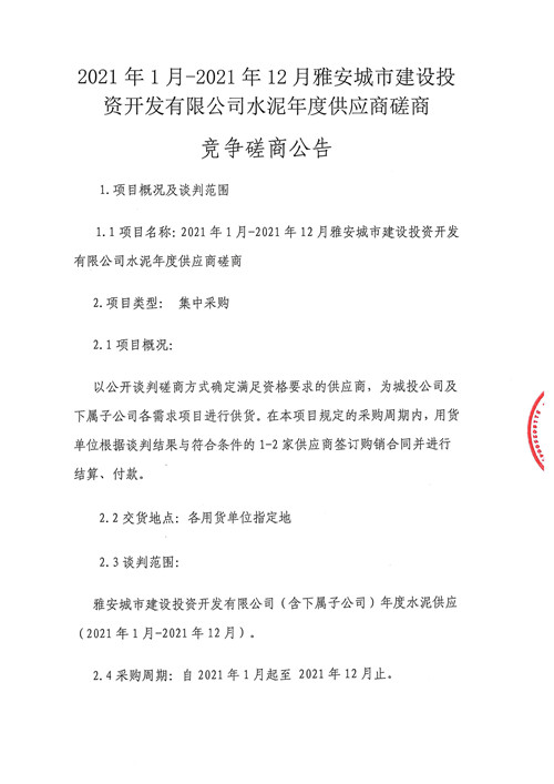 2021年1月-2021年12月雅安城市建設(shè)投資開發(fā)有限公司水泥年度供應(yīng)商磋商競爭磋商公告