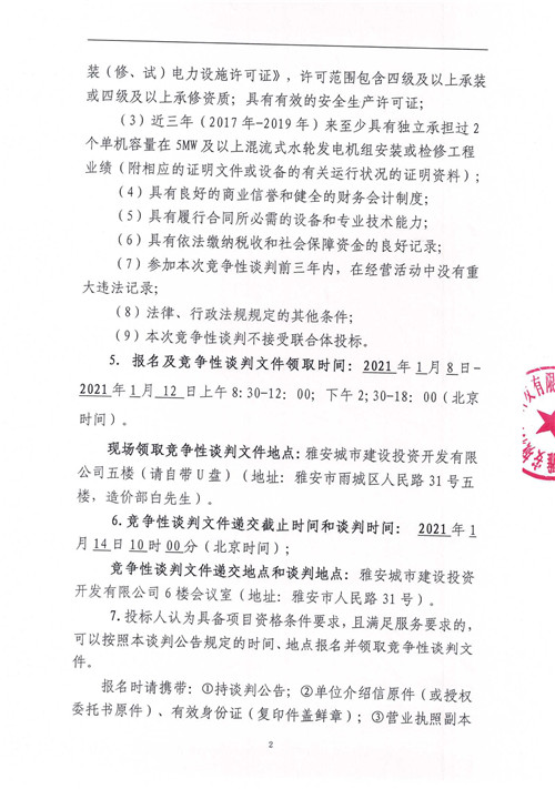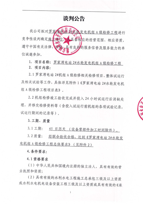 城利水電公司羅家灣電站2#水輪發(fā)電機(jī)組A級(jí)檢修工程競爭性談判公告