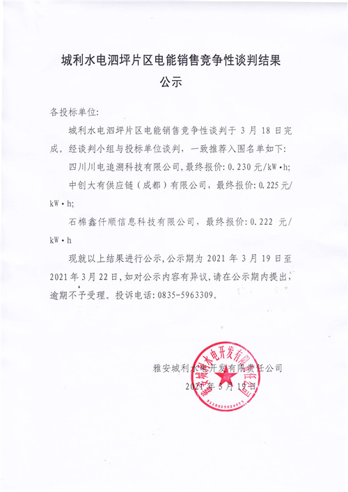 城利水電公司泗坪片區(qū)電站電能銷售競(jìng)爭(zhēng)性談判結(jié)果公示