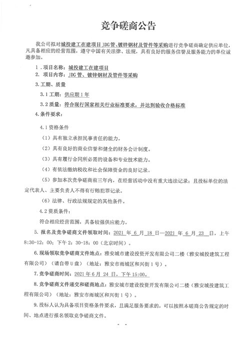 城投建工公司在建項目JDG管、鍍鋅鋼材及管件等采購競爭性磋商公告