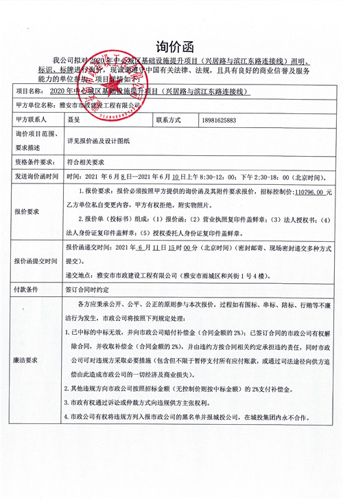 雅安市政公司2020年中心城區(qū)基礎(chǔ)設(shè)施提升項目(興居路與濱江東路連接線)照明、標識、標牌詢價函