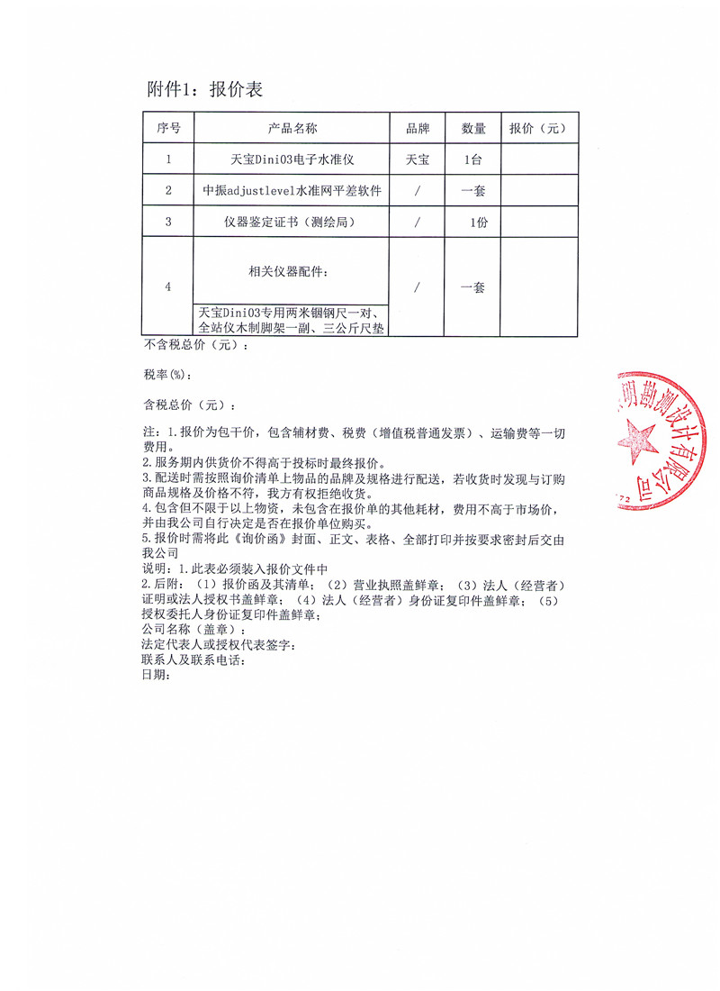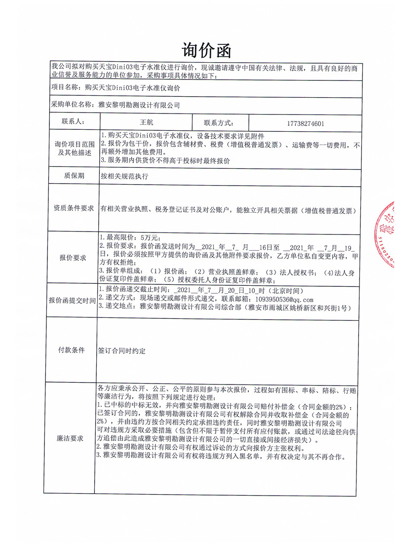 黎明勘測(cè)公司關(guān)于購買天寶Dini03電子水準(zhǔn)儀的詢價(jià)函