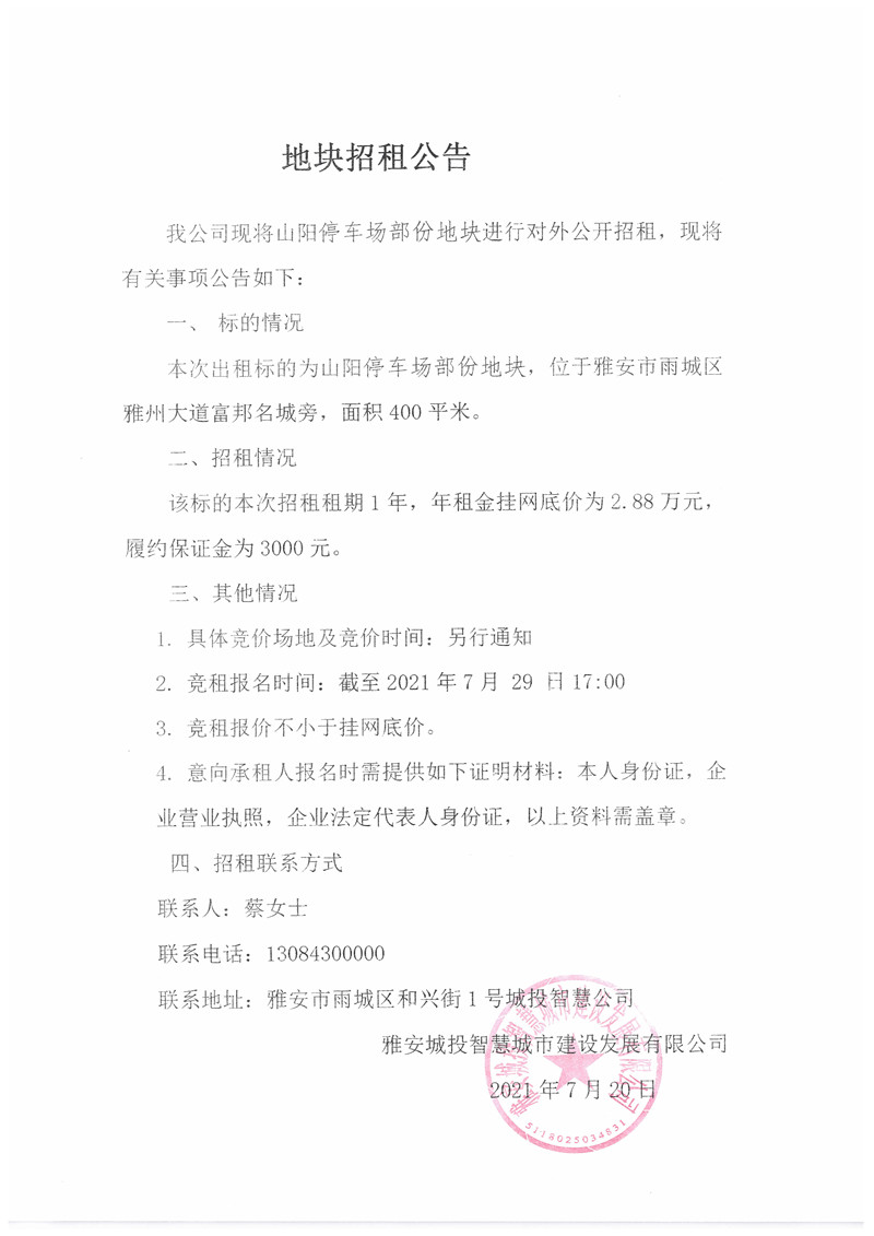 城投智慧公司山陽(yáng)停車場(chǎng)部分地塊招租公告(400㎡)