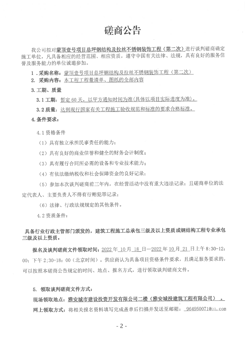 蒙頂壹號項目總坪鋼結(jié)構(gòu)及拉絲不銹鋼裝飾工程(第二次)談判磋商公告