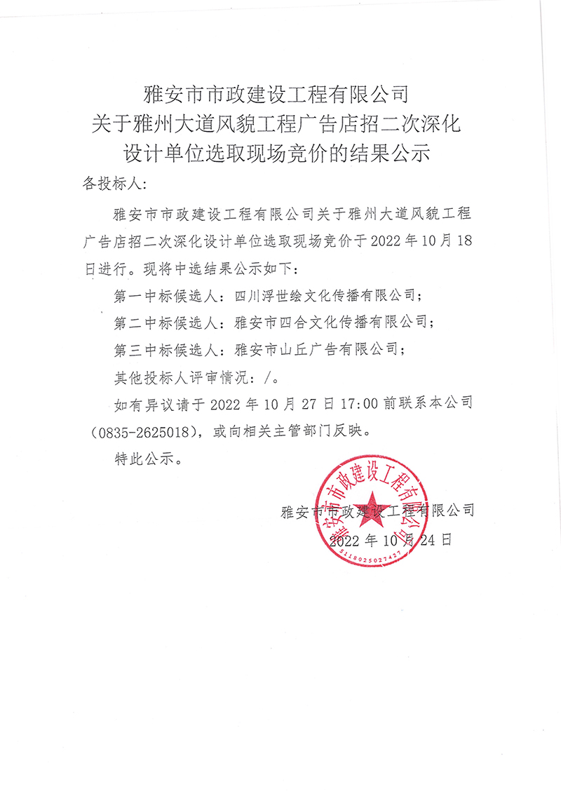 雅安市市政建設(shè)工程有限公司關(guān)于雅州大道風(fēng)貌工程廣告店招二次深化設(shè)計單位選取現(xiàn)場競價的結(jié)果公示
