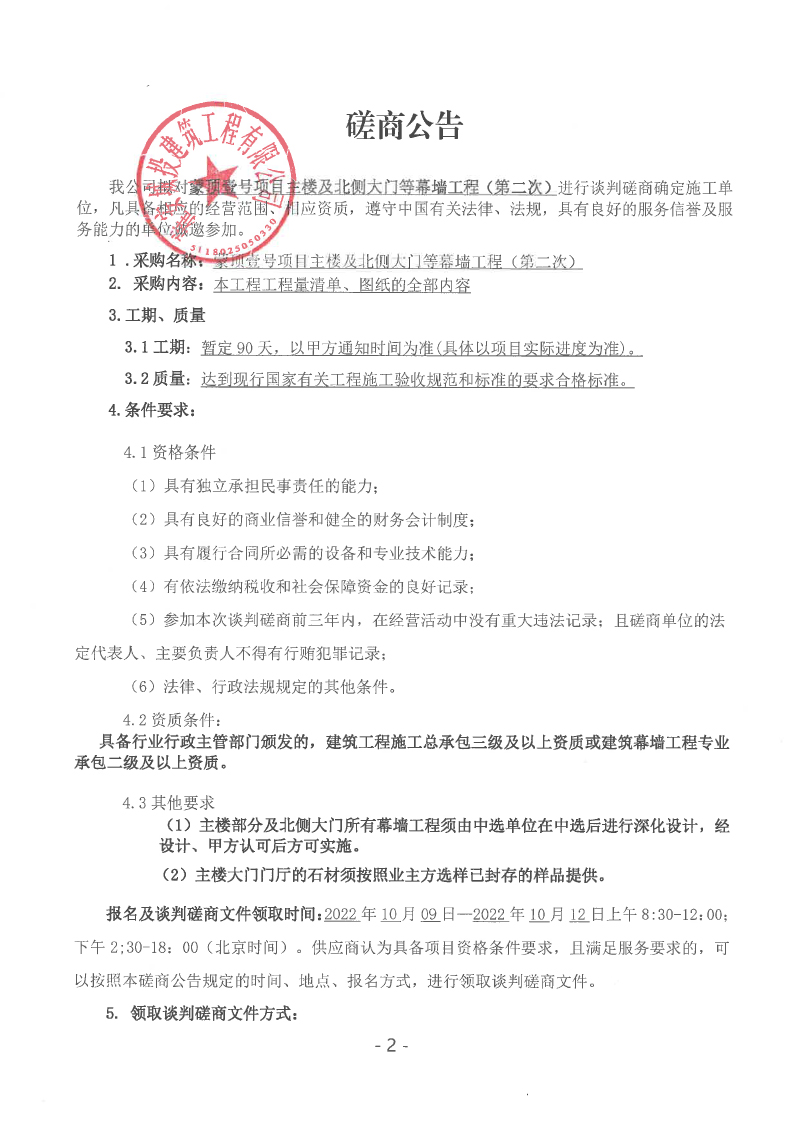 蒙頂壹號項目主樓及北側大門等幕墻工程(第二次)談判磋商公告