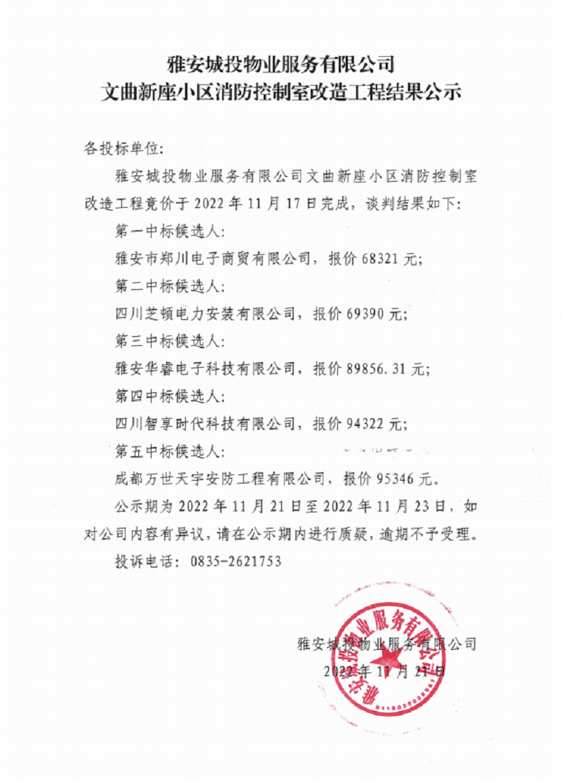雅安城投物業(yè)服務(wù)有限公司文曲新座小區(qū)消防控制室改造工程結(jié)果公示