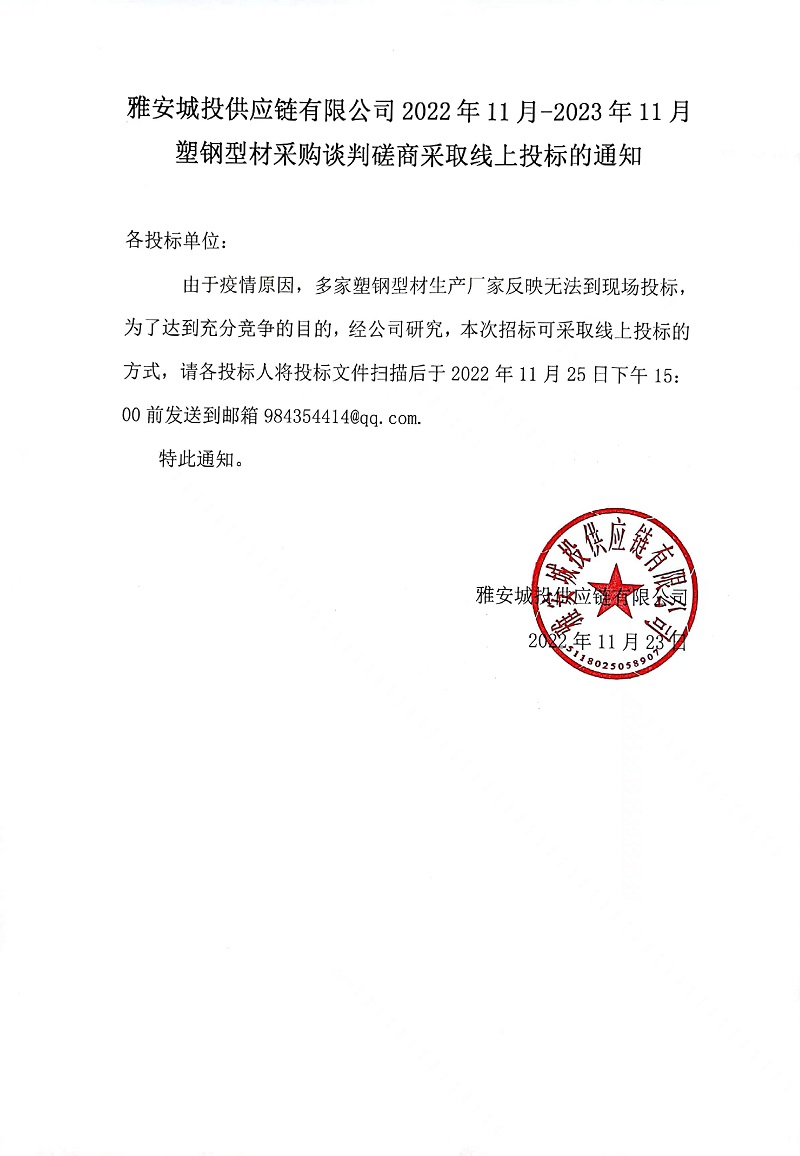 雅安城投供應鏈有限公司2022年11月-2023年11月塑鋼型材采購談判磋商采取線上投標的通知