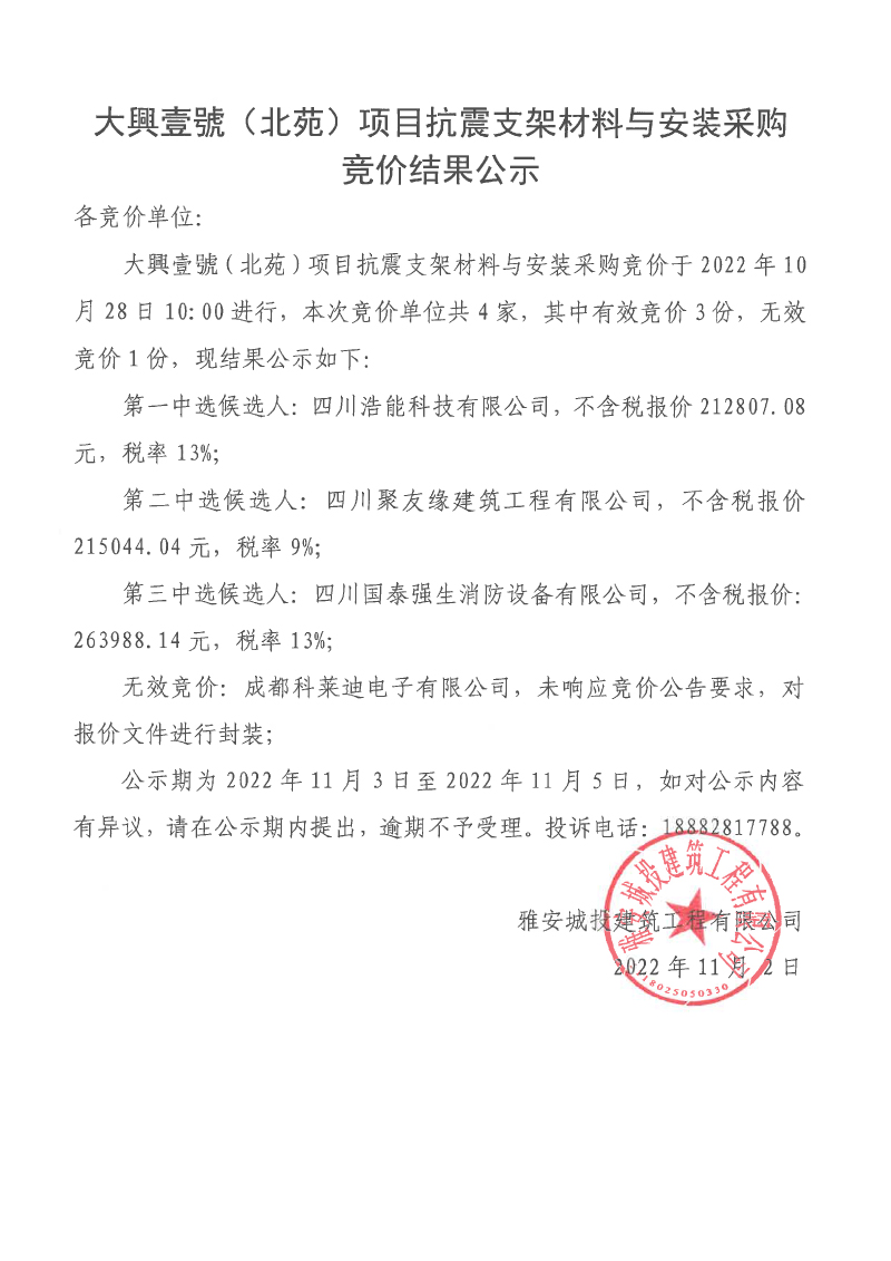 大興壹號(北苑)項目抗震支架材料與安裝采購競價結(jié)果公示