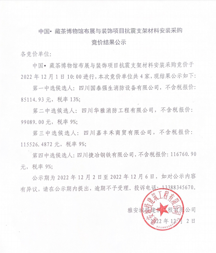 中國·藏茶博物館布展與裝飾項(xiàng)目抗震支架材料安裝采購競價(jià)結(jié)果公示
