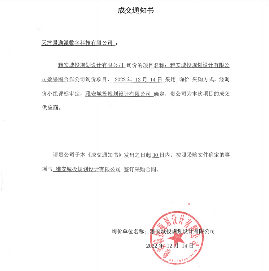 雅安城投規(guī)劃設計有限公司效果圖詢價成交通知書