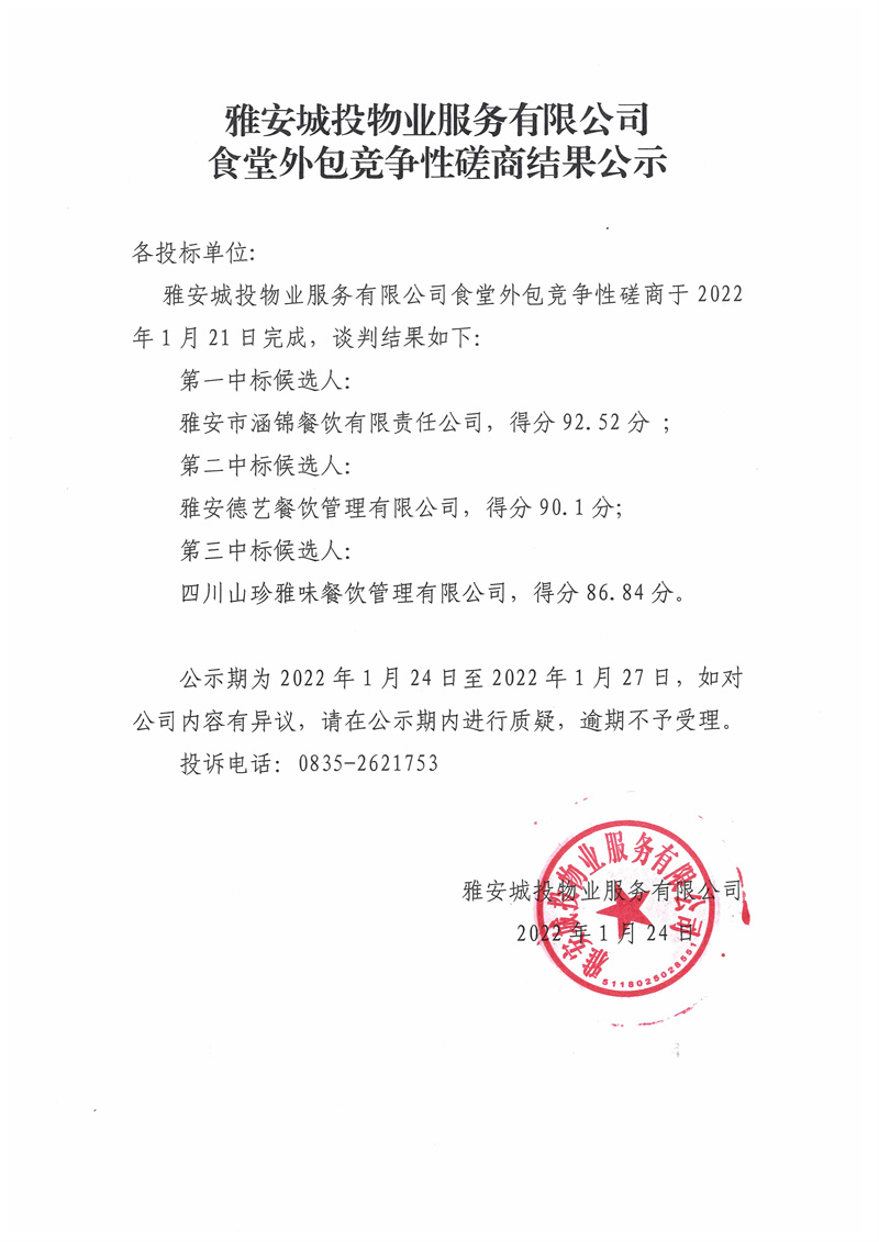 雅安城投物業(yè)服務(wù)有限公司食堂外包競(jìng)爭(zhēng)性磋商結(jié)果公告
