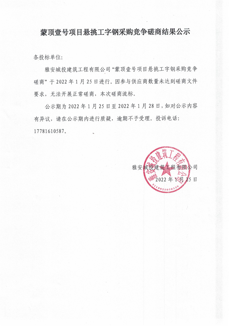 蒙頂壹號(hào)項(xiàng)目懸挑工字鋼采購(gòu)競(jìng)爭(zhēng)磋商結(jié)果公示