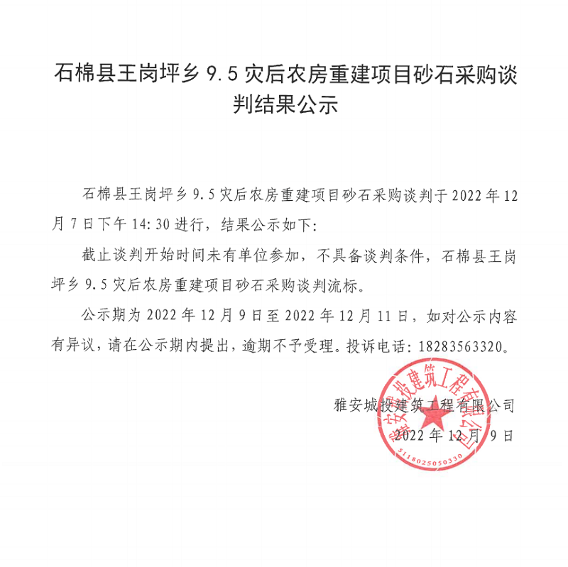 石棉縣王崗坪鄉(xiāng)9.5災(zāi)后農(nóng)房重建項目砂石采購談判結(jié)果公示