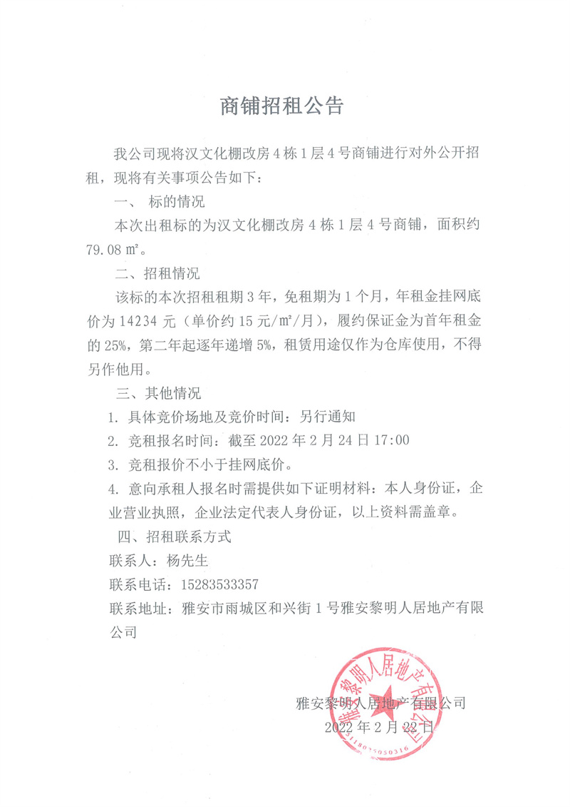 漢文化棚改房4棟1層4號(hào)商鋪招租公告