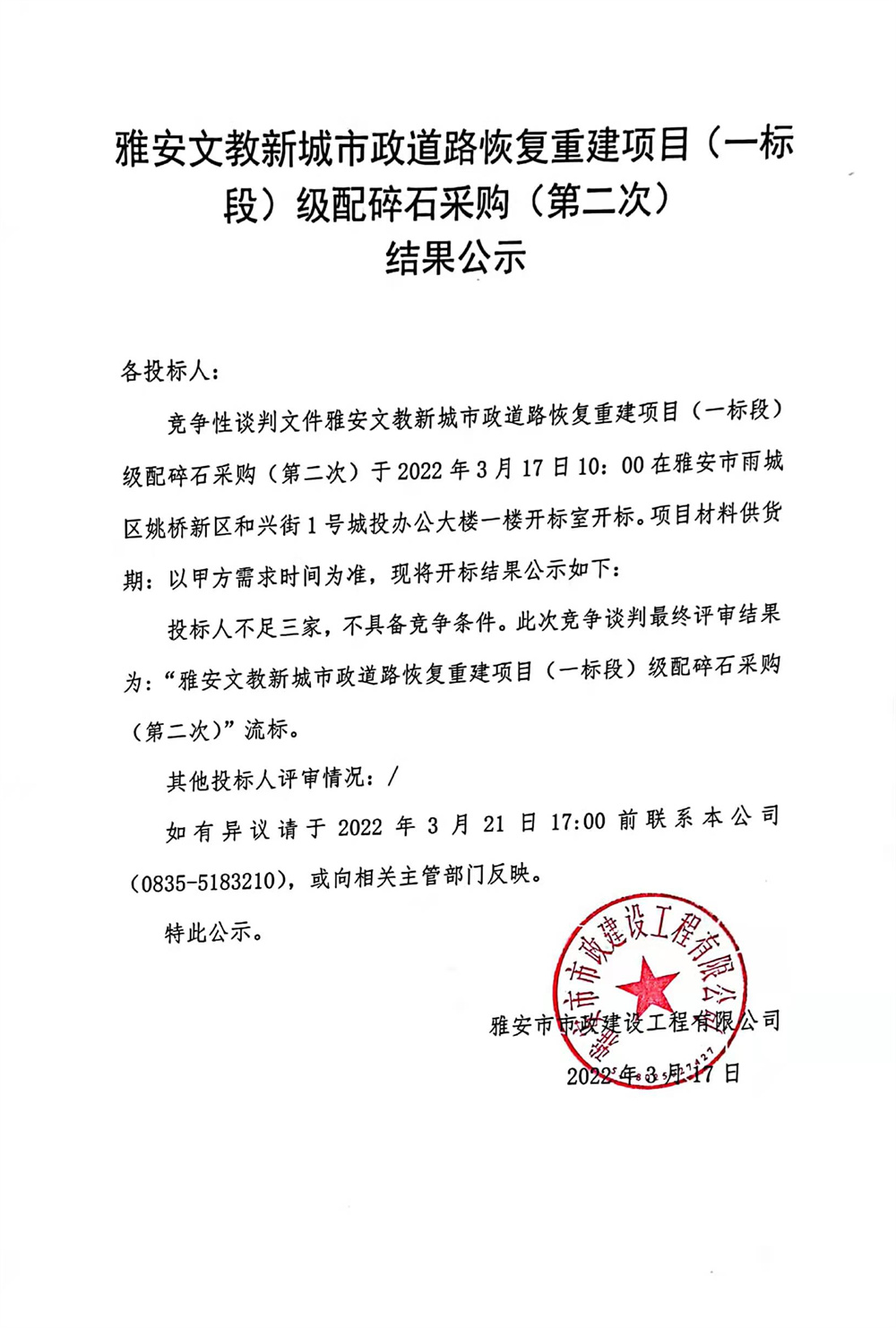雅安文教新城市政道路恢復(fù)重建項(xiàng)目(一標(biāo)段)級配碎石采購(第二次)結(jié)果公示