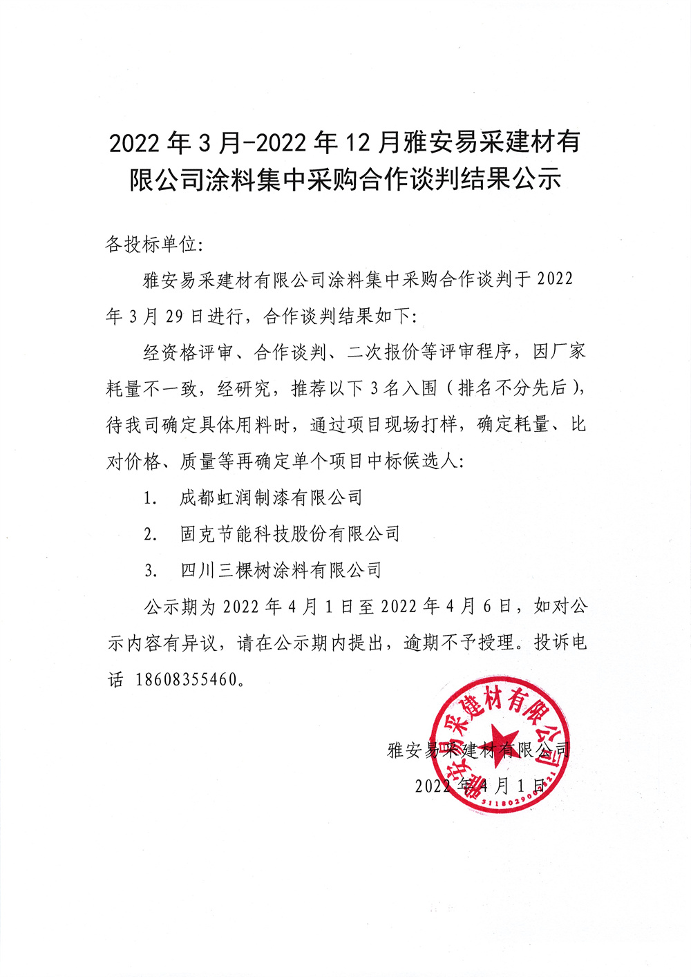2022年3月-2022年12月雅安易采建材有限公司涂料集中采購(gòu)合作談判結(jié)果公示
