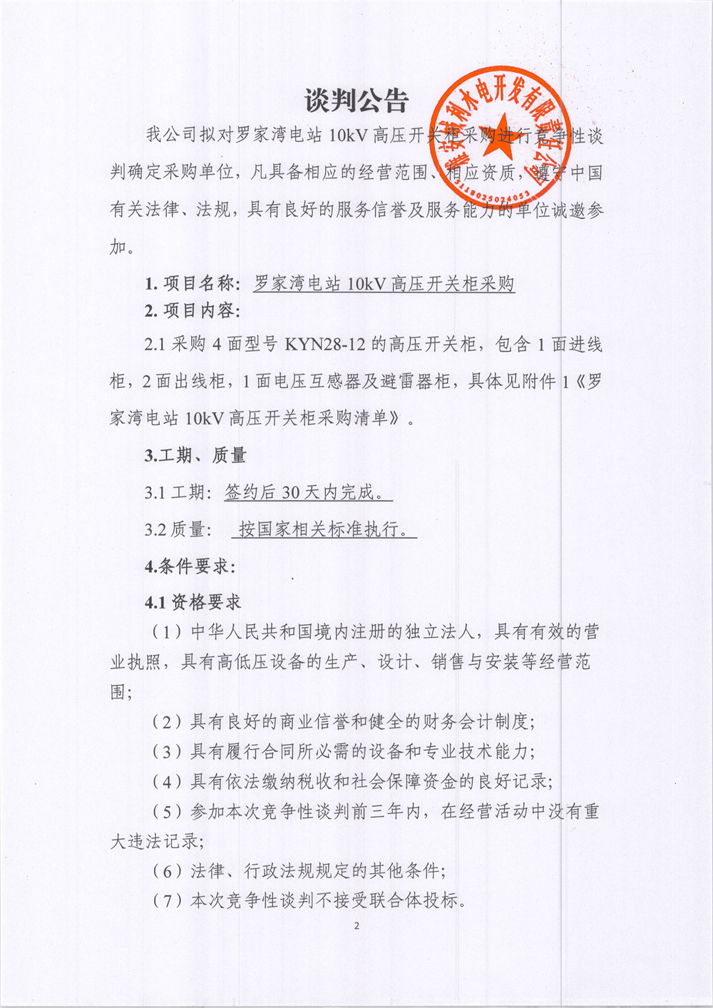 城利水電公司羅家灣電站10KV高壓開(kāi)關(guān)柜柜采購(gòu)競(jìng)爭(zhēng)性談判公告