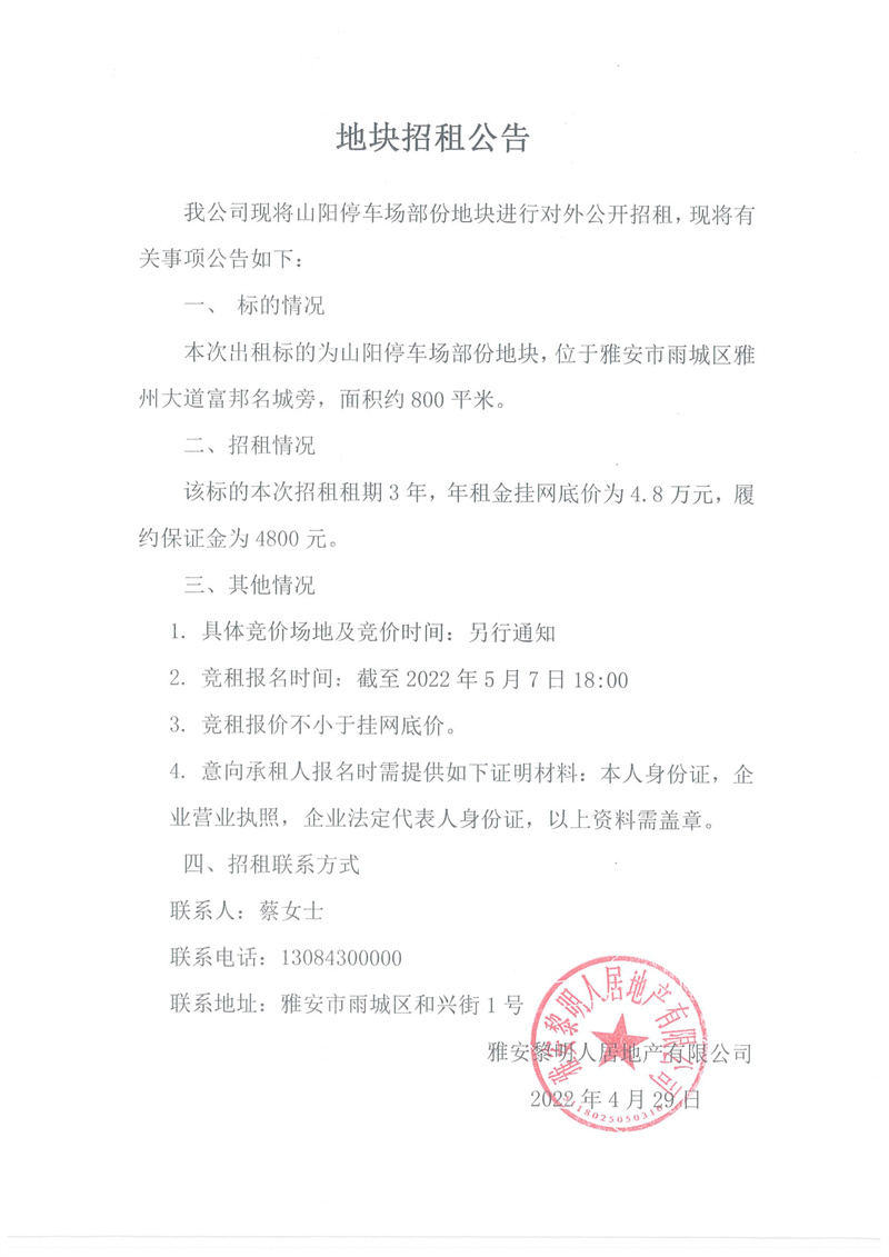 黎明人居公司山陽停車場部分地塊招租公告