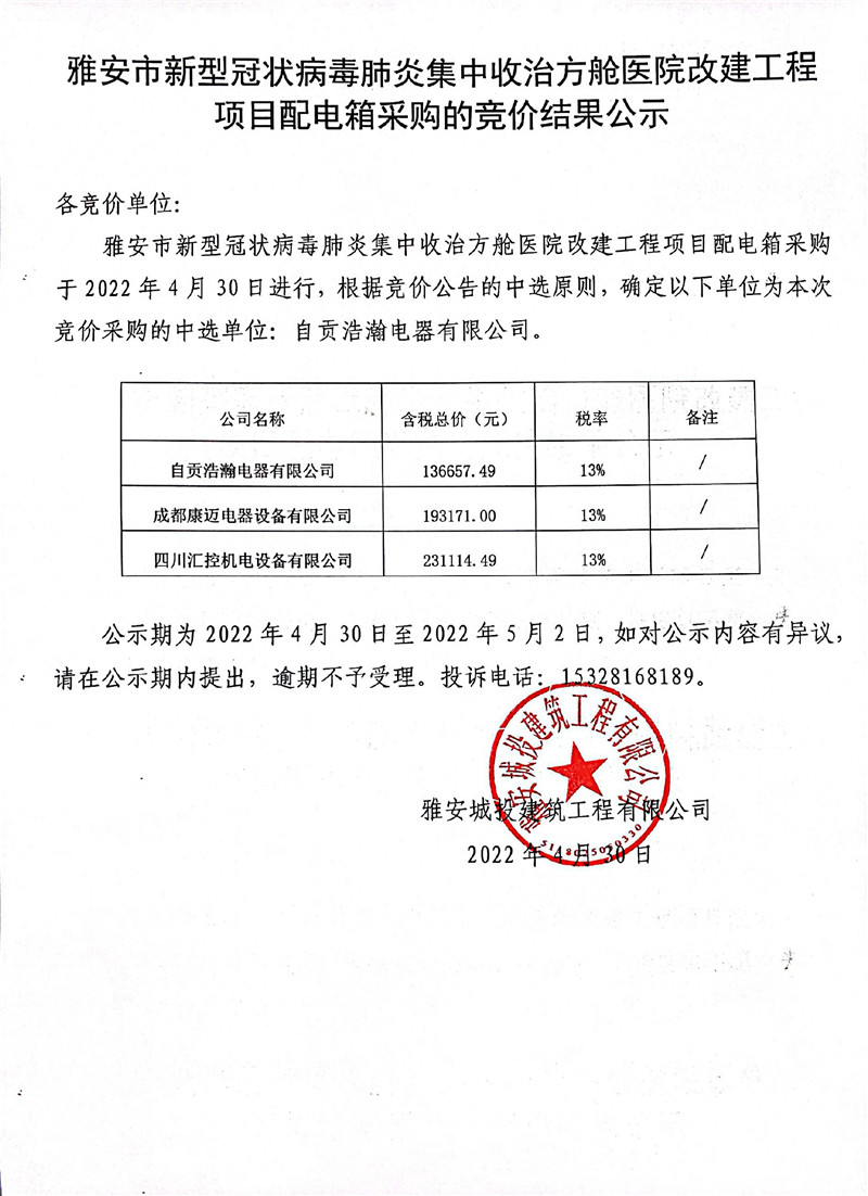 雅安市新型冠狀病毒肺炎集中收治方艙醫(yī)院改建工程項(xiàng)目配電箱采購的競價(jià)結(jié)果公示