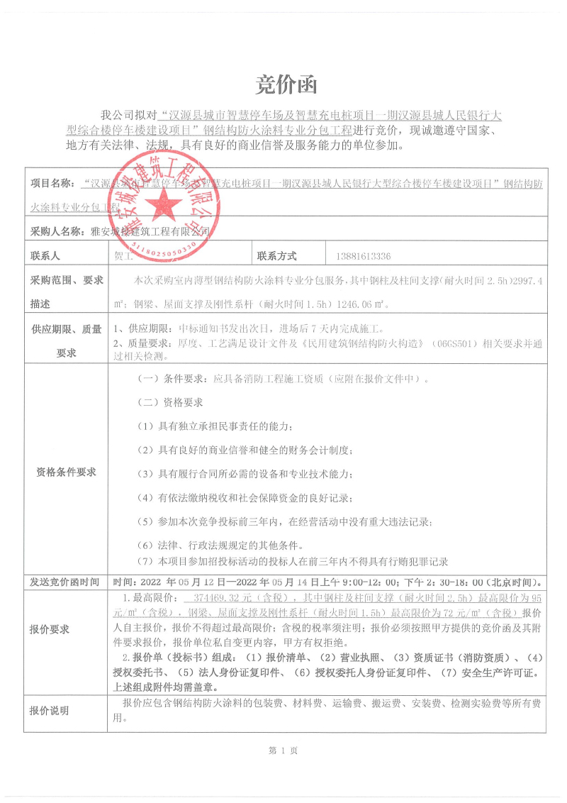 漢源縣城市智慧停車(chē)場(chǎng)及智慧充電樁項(xiàng)目一期漢源縣城人民銀行大型綜合樓停車(chē)樓建設(shè)項(xiàng)目防火涂料專(zhuān)業(yè)分包競(jìng)價(jià)采購(gòu)公告