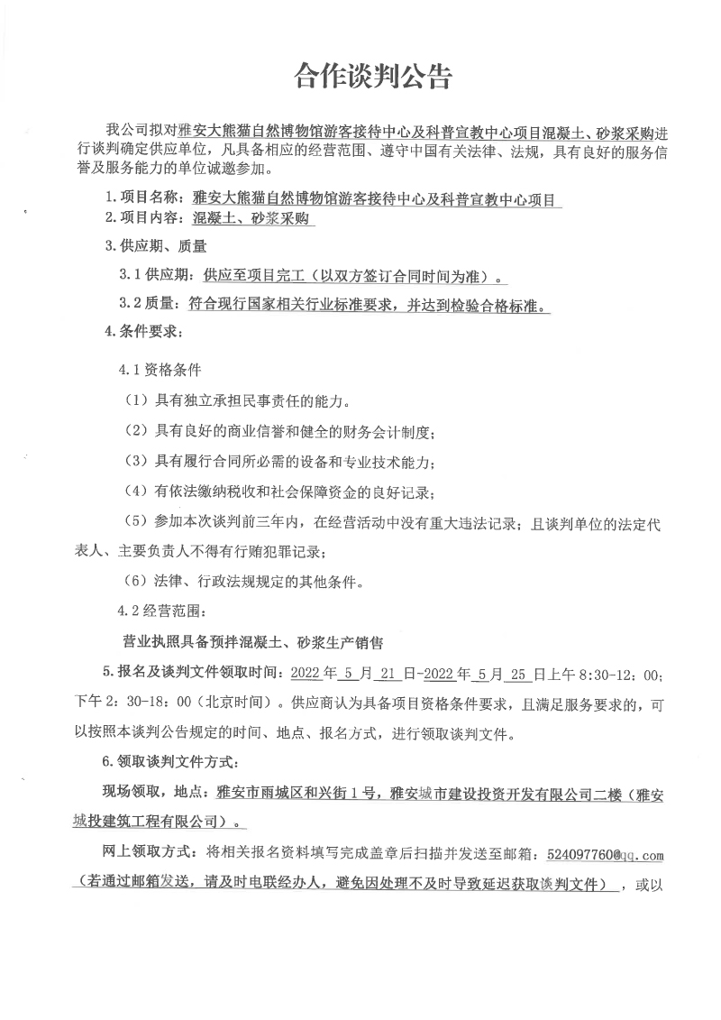 雅安大熊貓自然博物館游客接待中心及科普宣教中心項(xiàng)目混凝土、砂漿采購合作談判公告
