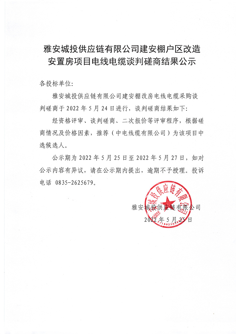 雅安城投供應(yīng)鏈有限公司建安公司棚戶區(qū)改造安置房項目電線電纜談判磋商結(jié)果公示