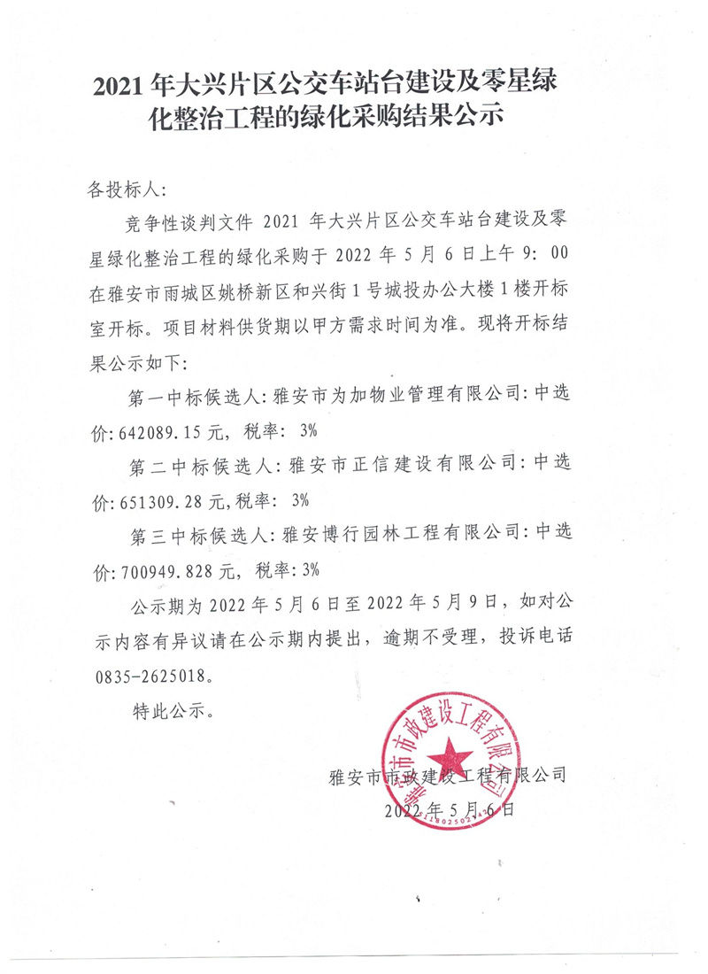 2021年大興片區(qū)公交站臺(tái)建設(shè)及零星綠地整治工程的綠化采購(gòu)結(jié)果公示
