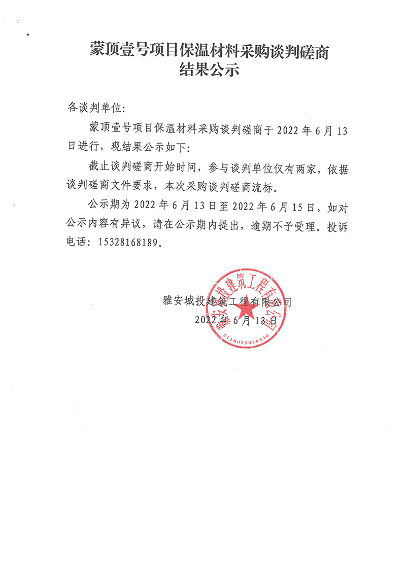 蒙頂壹號項(xiàng)目保溫材料采購談判磋商結(jié)果公示