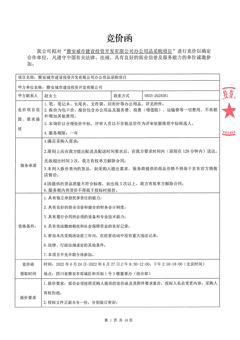 雅安城市建設(shè)投資開發(fā)有限公司辦公用品采購項(xiàng)目競價(jià)公告