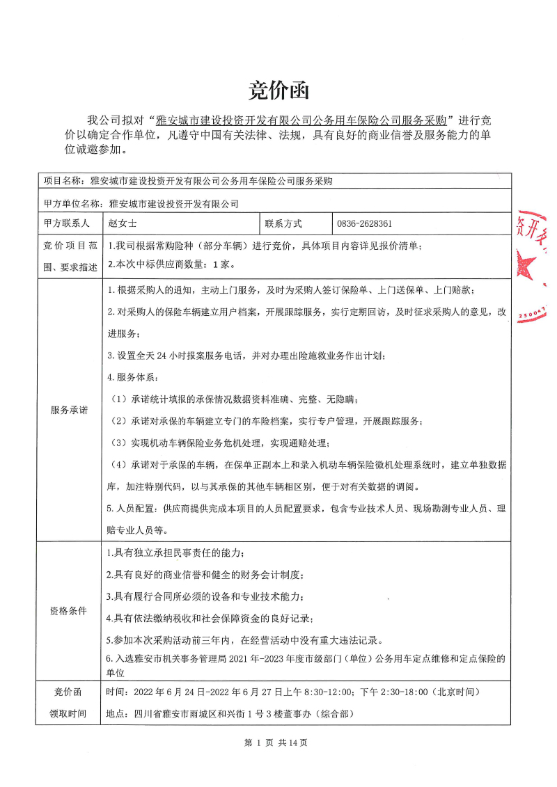 雅安城市建設(shè)投資開發(fā)有限公司公務(wù)用車保險(xiǎn)公司服務(wù)采購競價(jià)公告