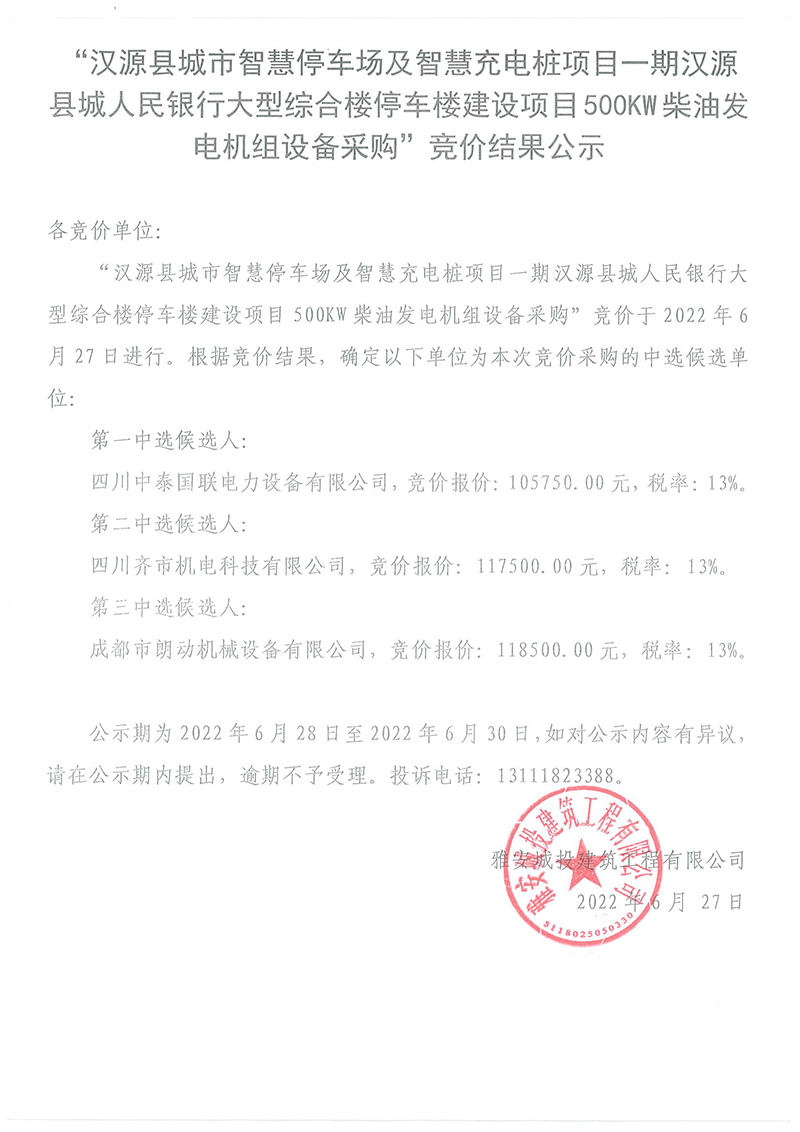 漢源縣城市智慧停車(chē)場(chǎng)及智慧充電樁項(xiàng)目一期漢源縣城人民銀行大型綜合樓停車(chē)樓建設(shè)項(xiàng)目500kw柴油發(fā)電機(jī)組設(shè)備采購(gòu)競(jìng)價(jià)結(jié)果公告